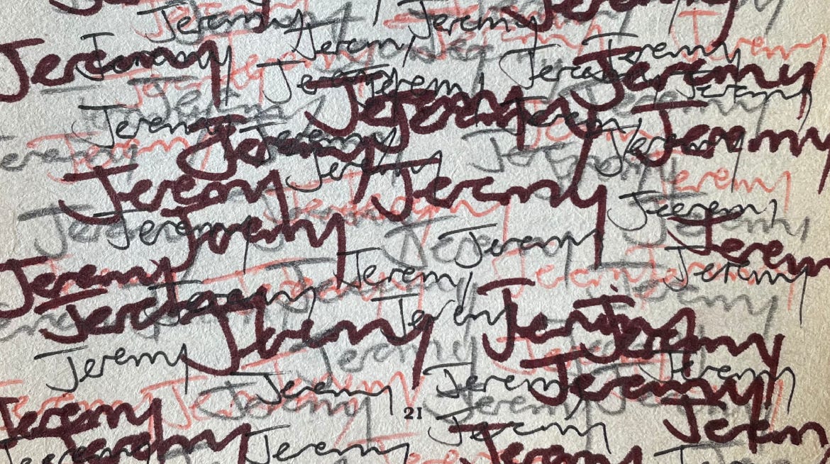 I remember introducing myself to my girlfriend’s aunt, who speaks no English, how she struggled to make sense of the noise a J makes in a language different to her own. I think of strangers, half swallowing my name when saying for the first time, hoping that they really did get it right, and that I wasn’t a John or a Jared. I think of my friends, who smile into my name when they say hello on the phone. I think of all the times my granny has said my name, all the questions, lessons, complements, hugs and kisses that started with Jeremy. I think of all the teachers calling my name in futile attempts to stop my endless chattering (I was always apologetic, but struggled to adjust my behaviour). I think of my anxious pride and fidgety fingers on the one or two occasions that my name was called out for an award. I think of the hot, suffocating dread that filled my body when my dentist called out my name, searching for his next root canal patient. For something that is theoretically mine, it seems to belong to the people that use it. It’s almost as though the person who calls my name, and the way they do it, has the biggest influence on the emotion stirred within me.